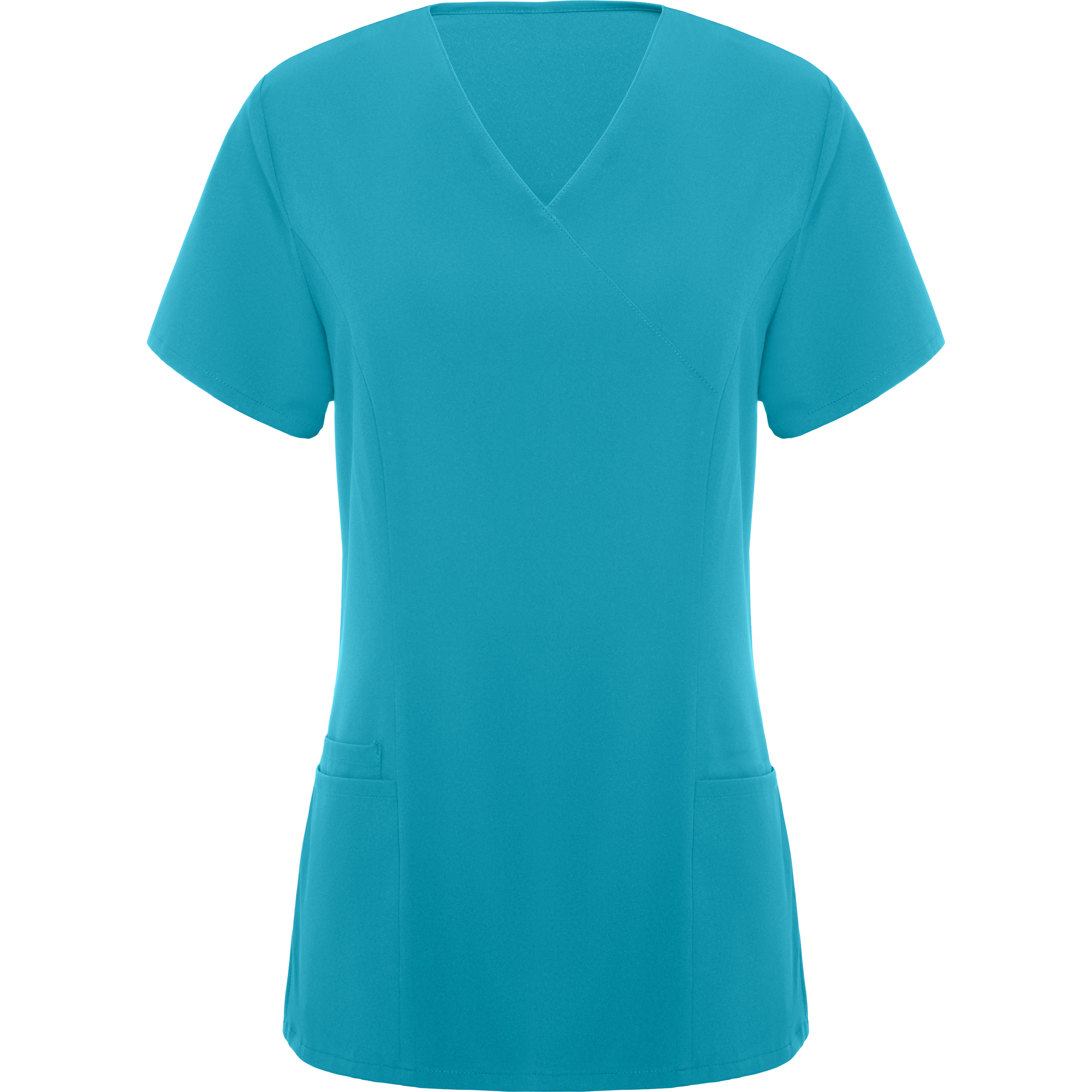 Casaca sanitaria de manga corta con cintura ligeramente ajustada.