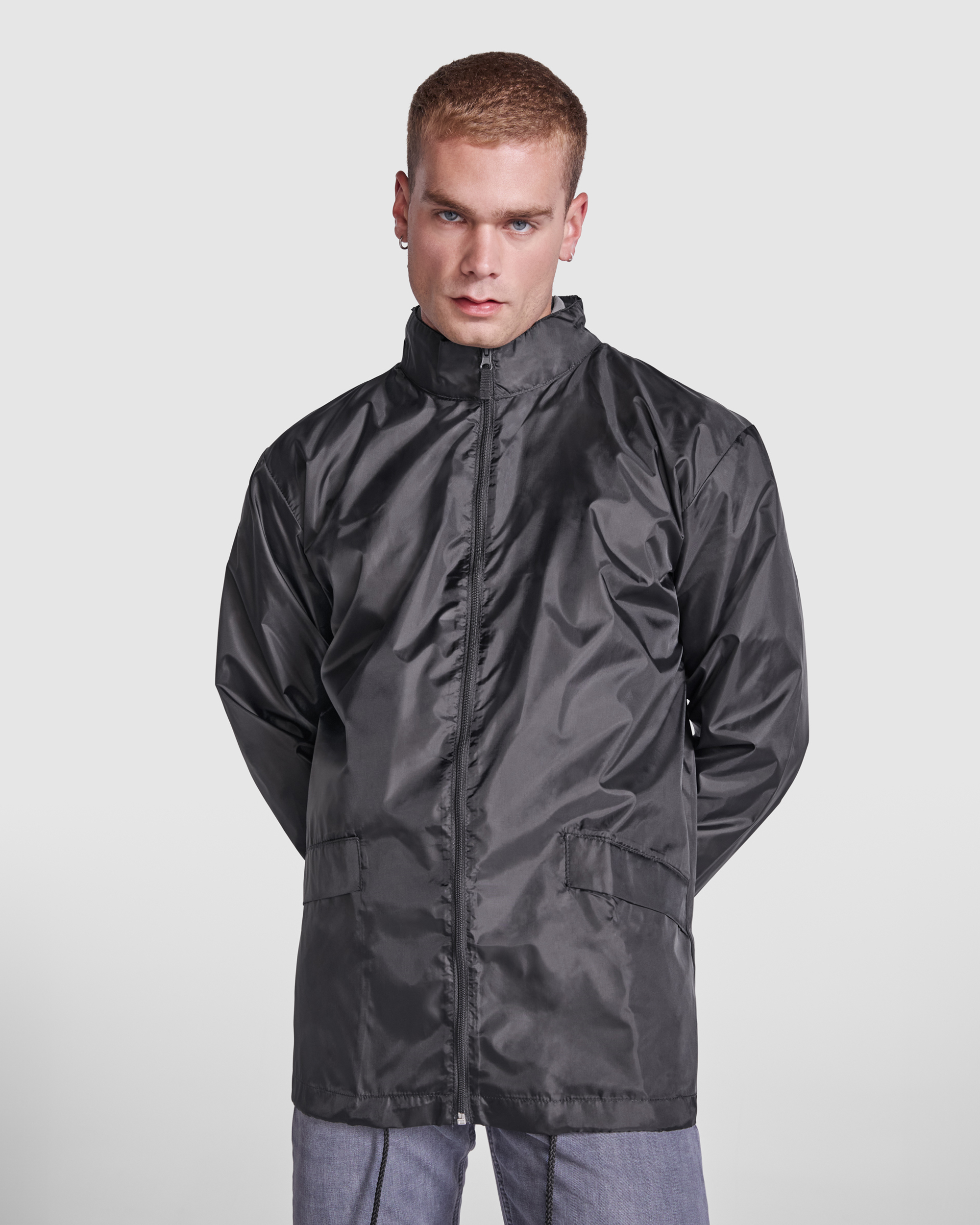 Chubasquero con cuello alto y capucha extraíble con cordón ajustable. Interior con revestimiento de plata. Cremallera frontal al tono. Bolsillos laterales con cremallera cubiertos por solapa del mismo tejido. Puños elásticos. Bajo con cordón interno ajustable. Goma en bolsillo para su plegado.