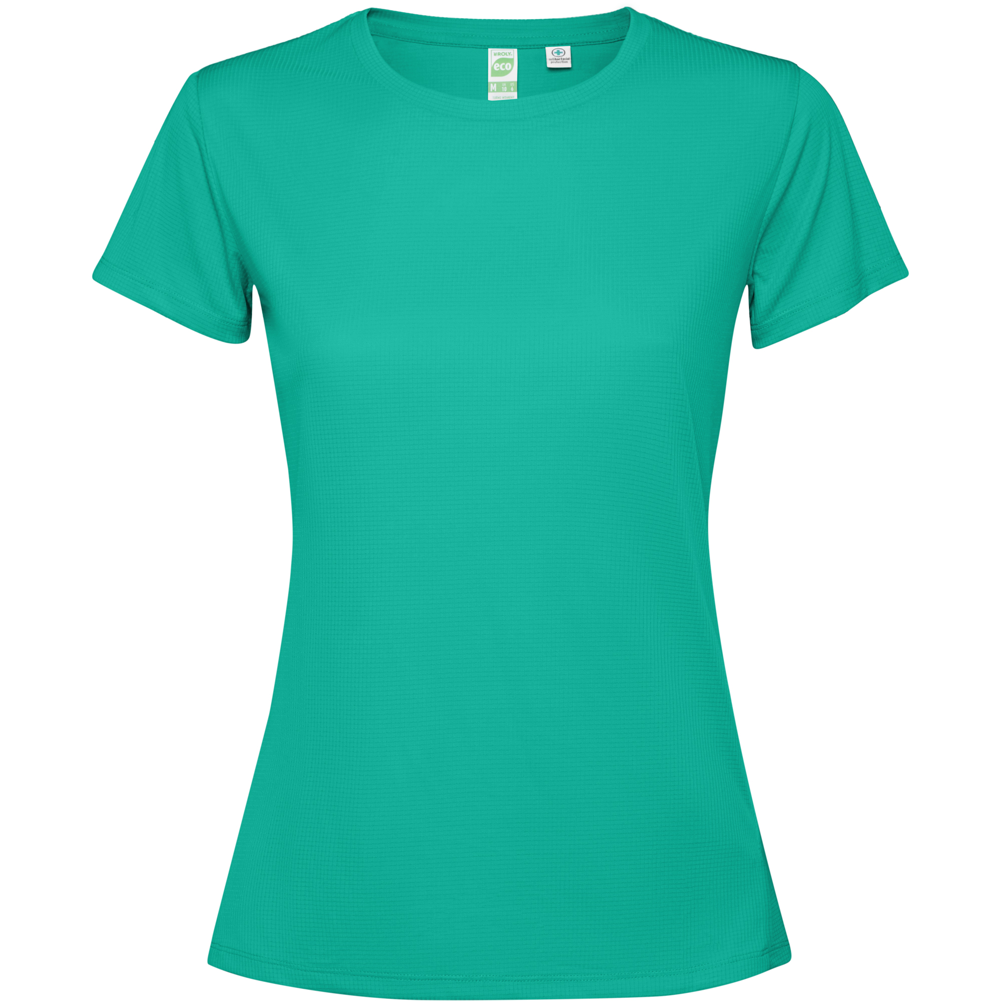 Camiseta técnica manga corta entallada transpirable. Roly Control Dry. Antibacteriano. Faldón trasero. Costuras laterales adelantadas. Cuello redondo y cubrecosturas del mismo tejido al tono. Certificado GRS.