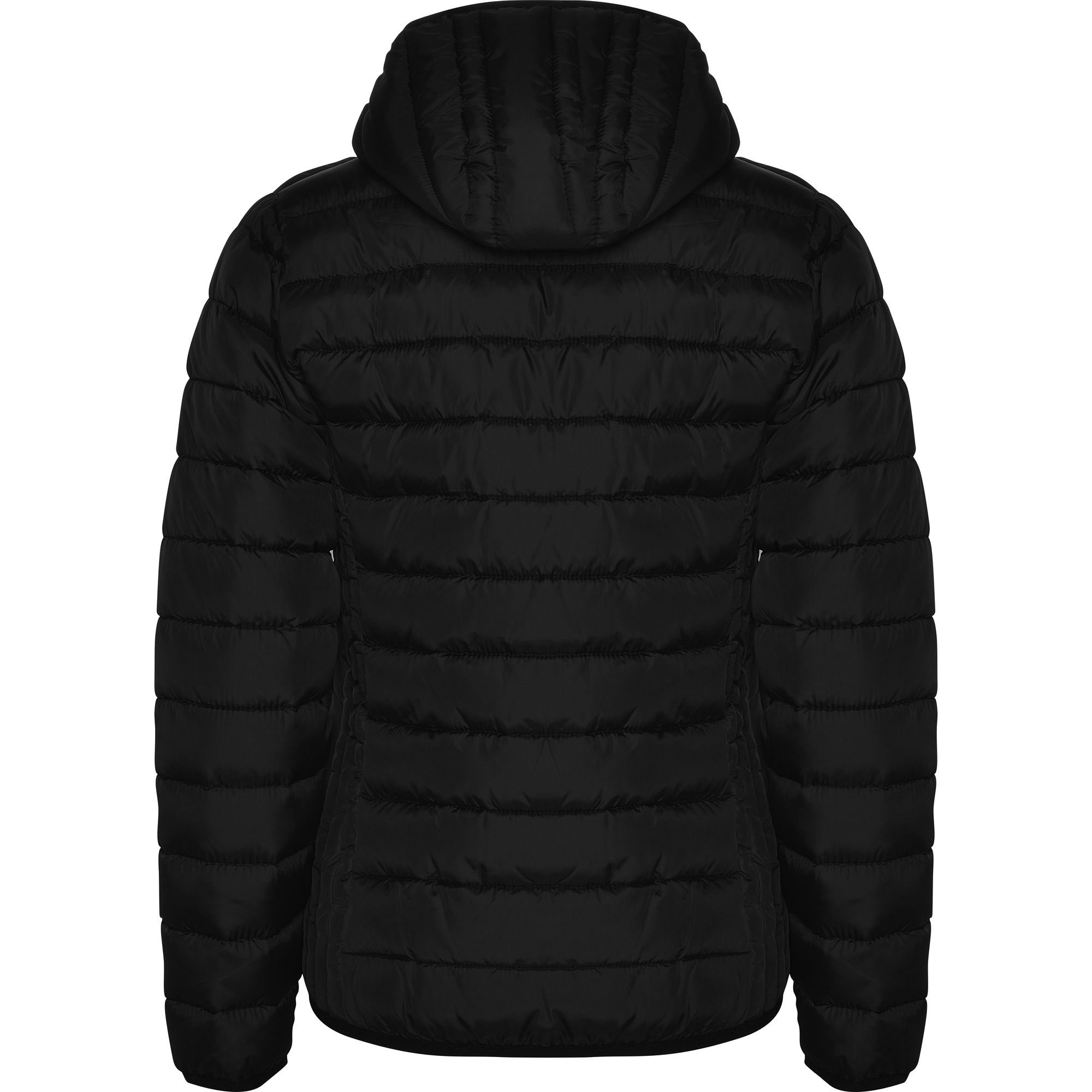Chaqueta con capucha acolchada resistente al agua. Cremallera frontal invertida al tono con protector de barbilla del mismo tejido. Bolsillos laterales con cremalleras invertidas al tono insertados en los paneles laterales con forma en pecho para mejor ajuste. Vivo elástico al tono en contorno de capucha, puños y bajo. Opción de colores lisos o a contraste en interior.