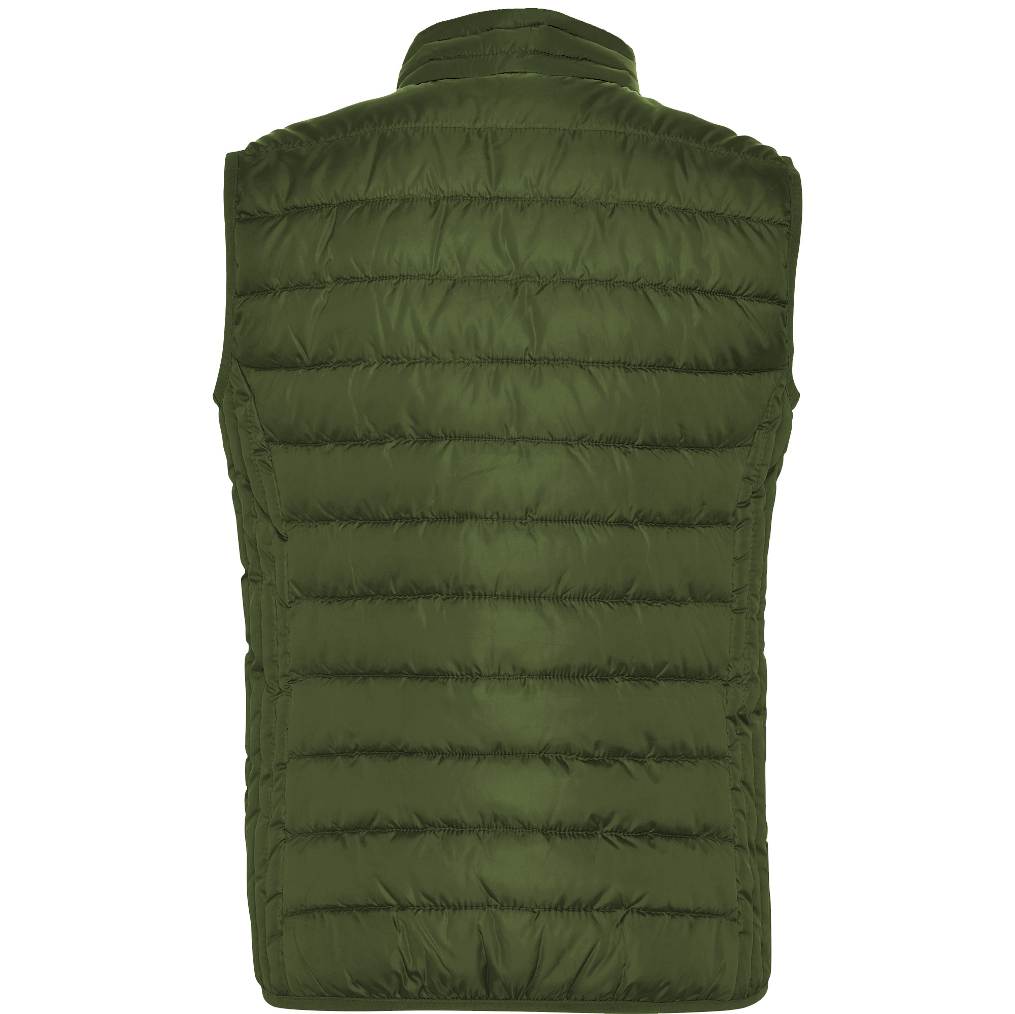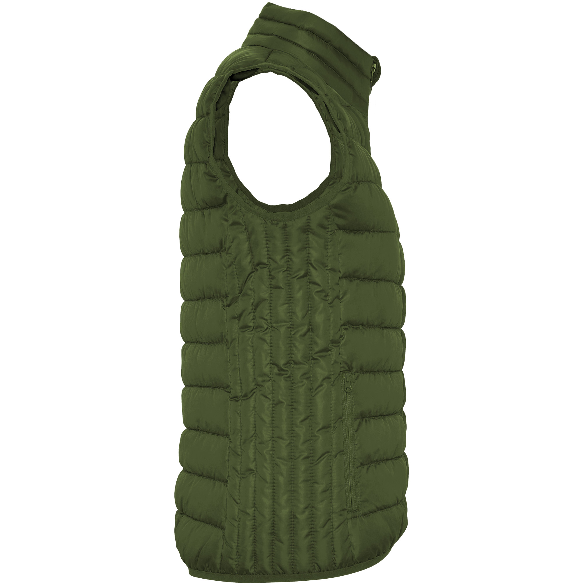 Chaleco acolchado resistente al agua. Cremallera frontal invertida al tono con protector de barbilla del mismo tejido. Bolsillos laterales con cremalleras invertidas al tono insertado en los paneles laterales con forma en pecho para mejor ajuste. Vivo elástico al tono en sisas y bajo. Opción de colores lisos o a contraste en interior.